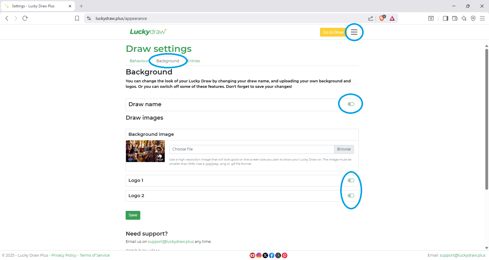 Lucky Draw Plus allows you customise your draw name, add a background image, and add up to two additional images or “logos”. Logo 1 and logo 2 could be any image, including your brand logo, sponsor logos, or text elements.