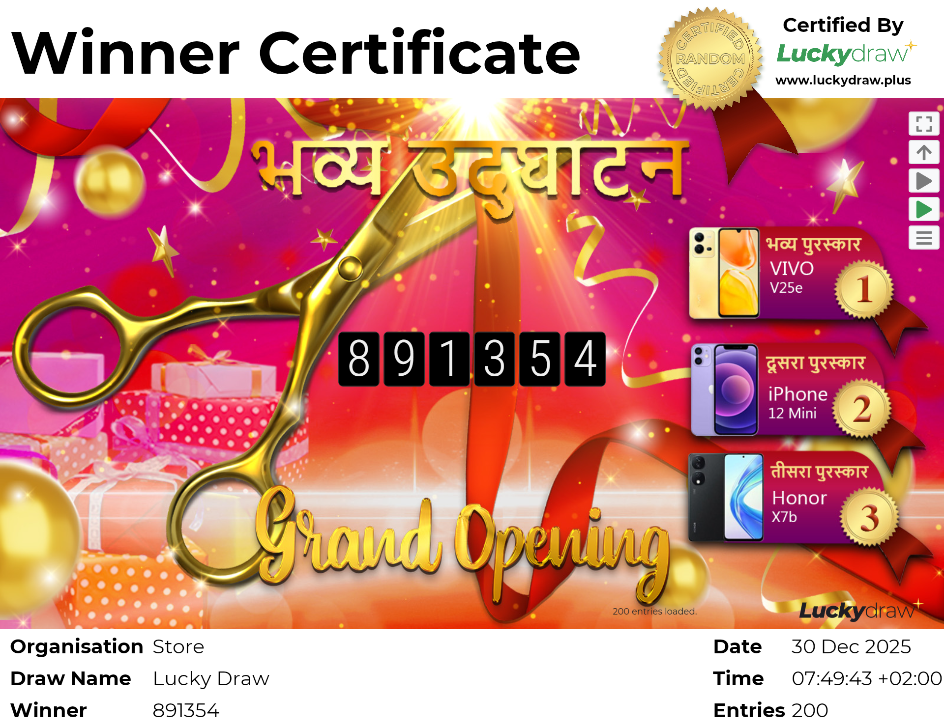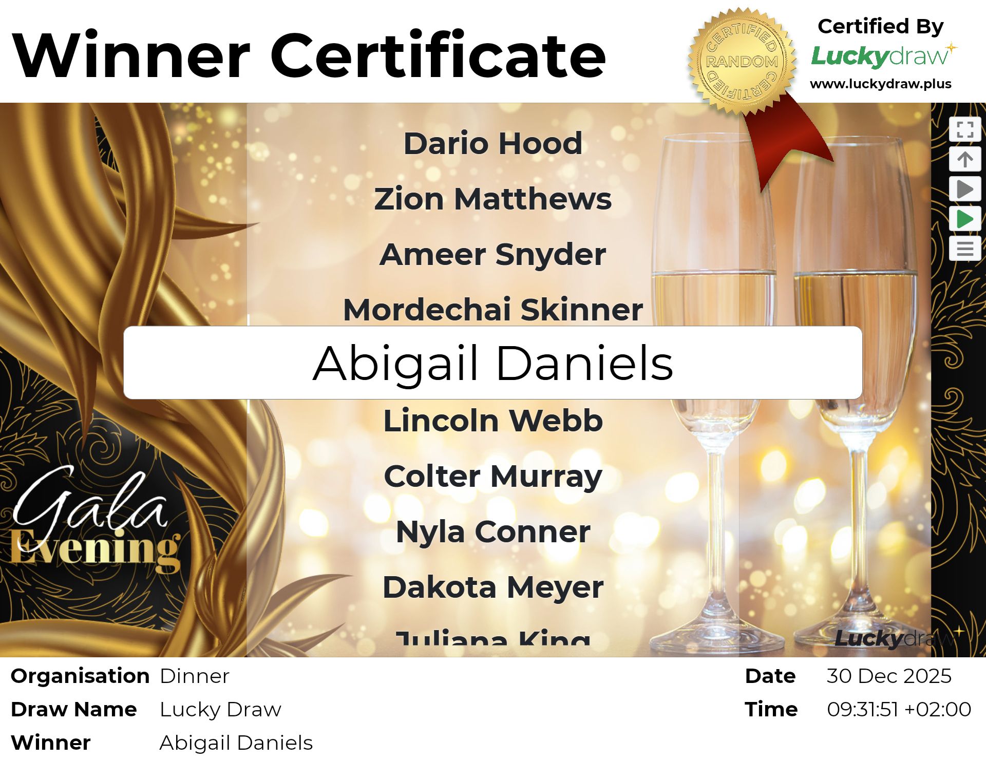 The winner certificate for this draw style shows only the winning entry on the screen.