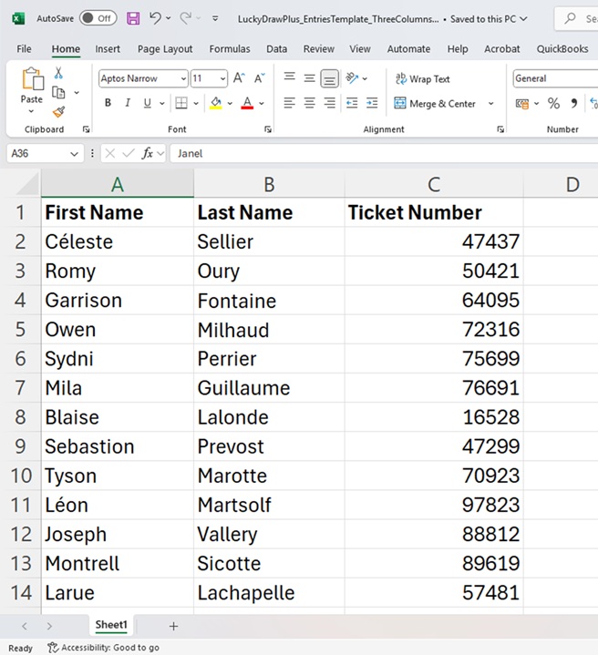 Use the file as is if appropriate (first three columns will be displayed in Lucky Draw Plus)