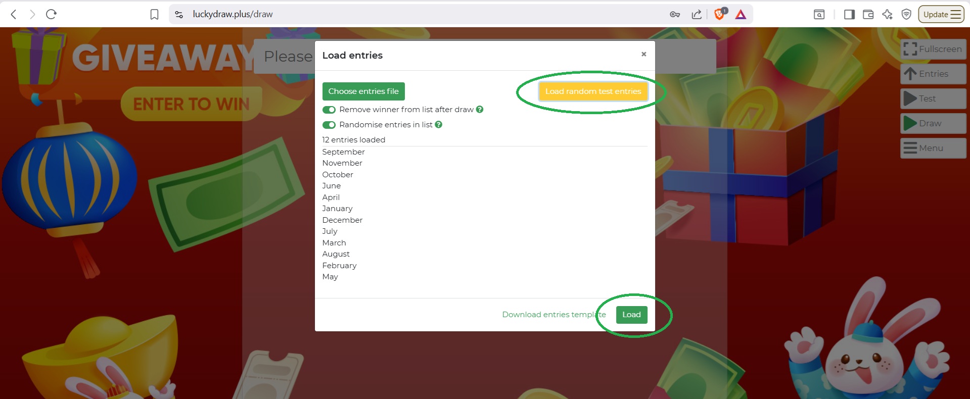 If you don’t have an entries file yet, click the Load random test entries button.