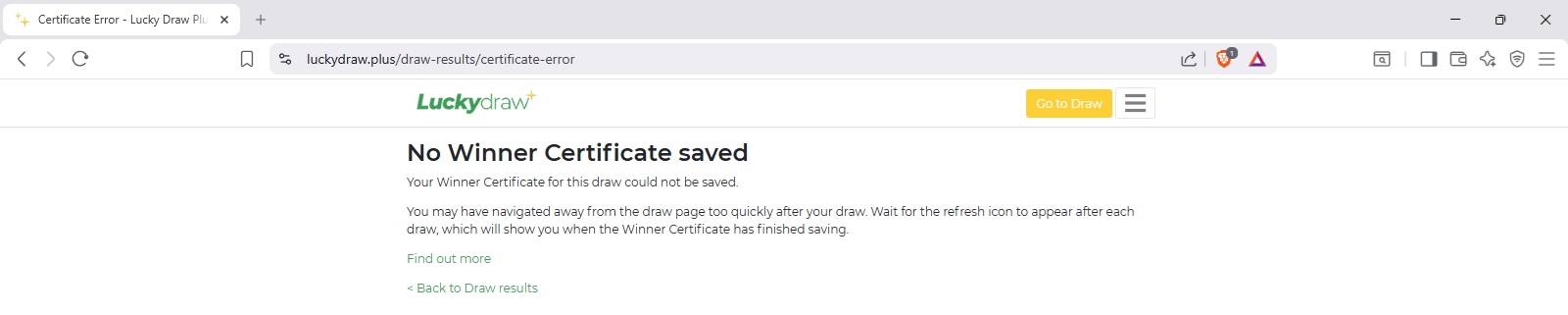 After your draw, it takes a second or two to save your winner certificate. If you navigate too quickly away from your draw, the certificate may not be saved in time. This includes if you: